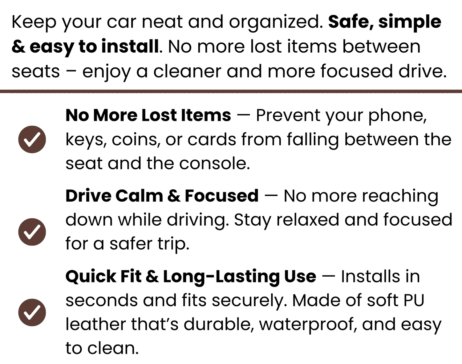 No more losing your keys, phone, or small essentials between the seats! Keep everything within easy reach and your car neat, organized, and clutter-free.