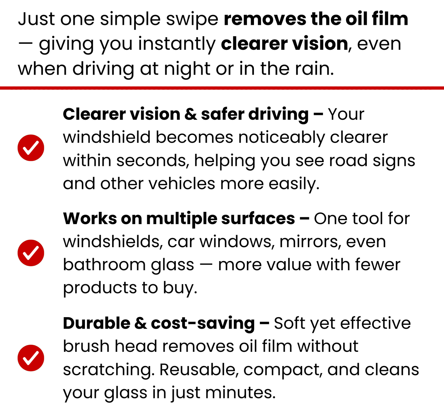 When oil residue builds up on your glass, it scatters light and creates harsh glare — especially at night or in the rain. Your vision becomes hazy, road signs look unclear, and headlights from other cars become extremely blinding.